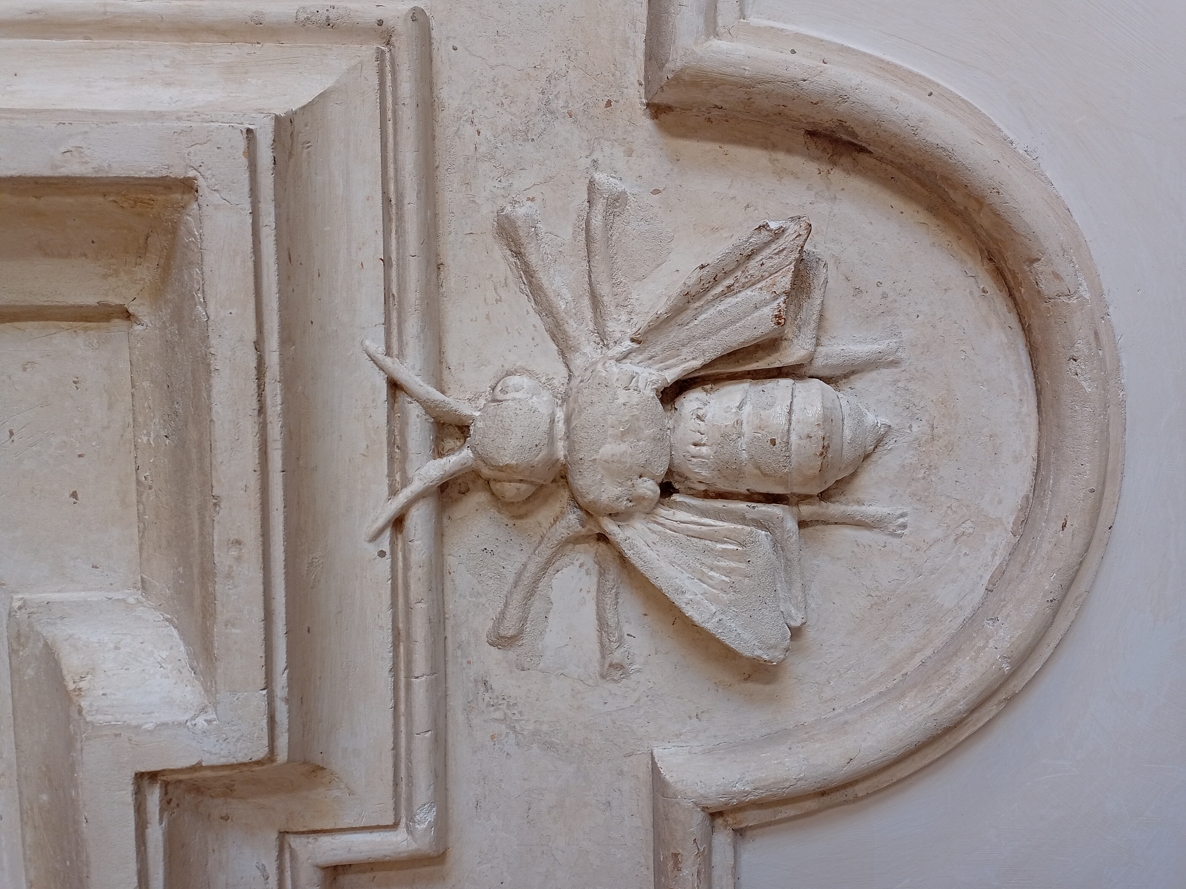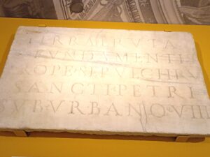 Začátek prací připomíná základní kámen označující pohřebiště vzniklé před dvěma tisícovkami let. Na kameni vyryté jméno Urbana VIII. Francesco Borromini následně osadí korunu baldachýnu okřídlenými anděly, putti a globem nesoucím křesťanský kříž. Aby stavitelé dokázali vyhovět papežově požadavku na ohromné množství pozlaceného bronzu, museli antický Pantheon doslova obrat o jeho výzdobu. Odtud pramení ona známá vtipná hláška, kterou po Římě roznesl Pasquino, nejznámější mluvící socha: „Co neudělali barbaři, dokonali Barberiniové.“